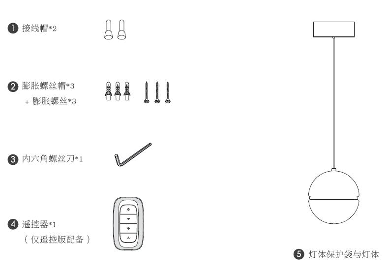 膨胀螺丝*3;膨胀塑料管*3;接线帽*2;内六角螺丝刀*1;遥控器*1(遥控版本);灯体*1;