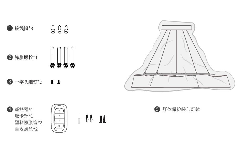 膨胀螺栓*4;十字头螺钉*2;接线帽*3;遥控器*1(遥控版本);灯体*1